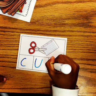 My assistant worked with our little scholars on segmenting CVC words. We start by just segmenting the sounds and then eventually graduate to moving the chips and writing the letter that makes the sound. Just like my Road to Reading: Phoneme Segmentation Fluency packet, we color-code the sounds. Green for the first sound, yellow for the medial, and red for the final sound.