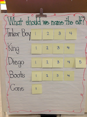 our elf made his debut! I channeled my inner thespian and pulled out all the stops to make it a magical morning for my little scholars. After reading the book, we voted on our name for the little fellow. I pulled 5 popsicle sticks and each of them suggested a name. I wrote the names on chart paper and each kiddo voted on their favorite. I suppose I should explain the names...so the first suggestion was Tinker Bell and I explained to the sweetie that our elf was a boy so she shouted, "Well, Tinker Boy then!" Not sure where King came from. Obviously Diego and Boots are from Dora. And Cone? Well, my only guess is we've been learning about solid shapes. I may or may not have skewed the votes. An elf named Cone, really?! :)