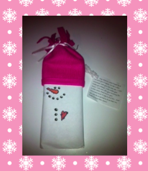 This homemade gift is easy peasy to make: just wrap a package of microwaveable popcorn in white paper, tie on a fleece hat and cut the edges, and draw a cute little face and a corn cob nose! Voila, simple and cheap!