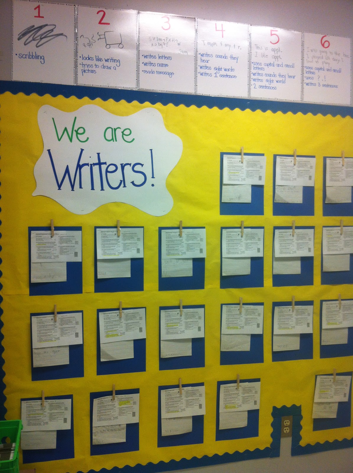 Anyway, I revamped my writing bulletin board (well, more like butcher paper I just staple gunned straight to my wall..oops!) with some inspiration from the one and only Pinterest! I created student friendly versions of the Developmental Writing Continuum (what our district uses to assess kiddos' writing) and hung all of their latest writing samples from clothespins. Just printed out yet another set of class photos and I'll stick those on the clothespin so we can easily tell who the writing belongs to.
