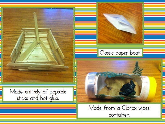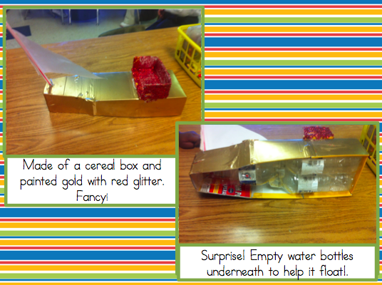 We just finished learning about objects that sink and float. Our culminating activity required our kiddos to make a boat at home and we experimented with them in class today. I was surprised at the creativity and ingenuity of our little scientists' boats! Check them out :)