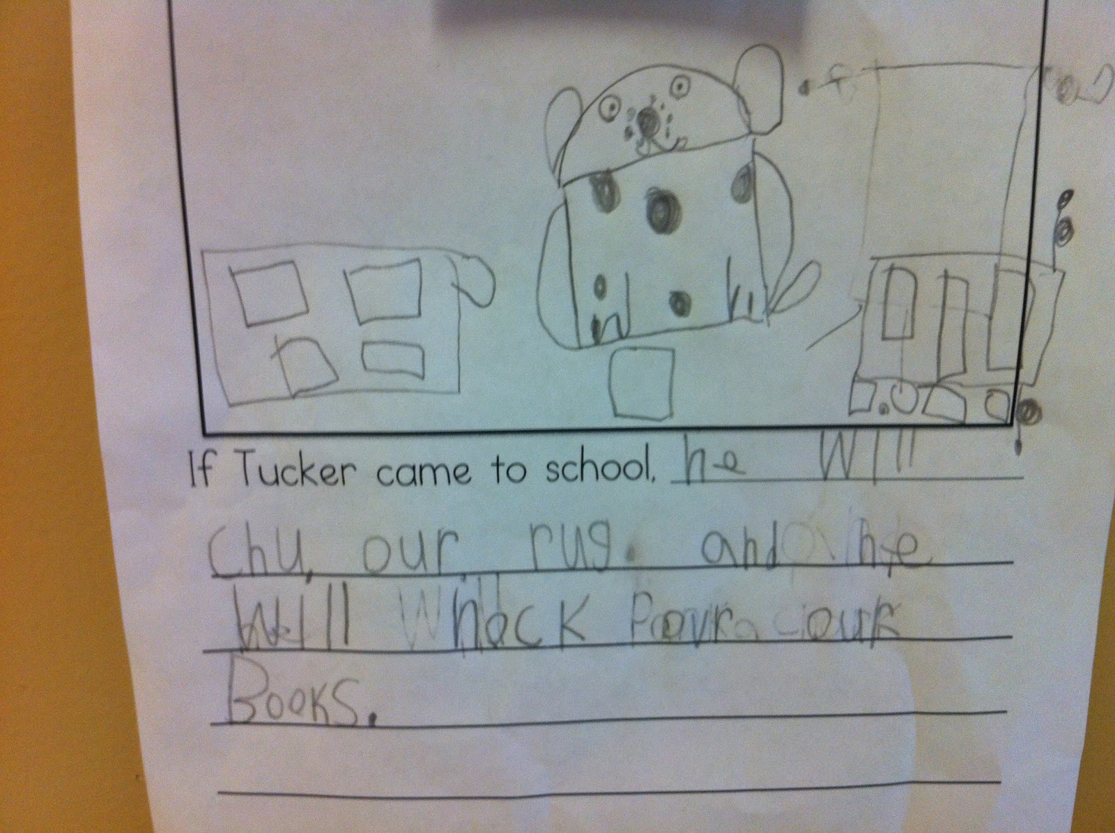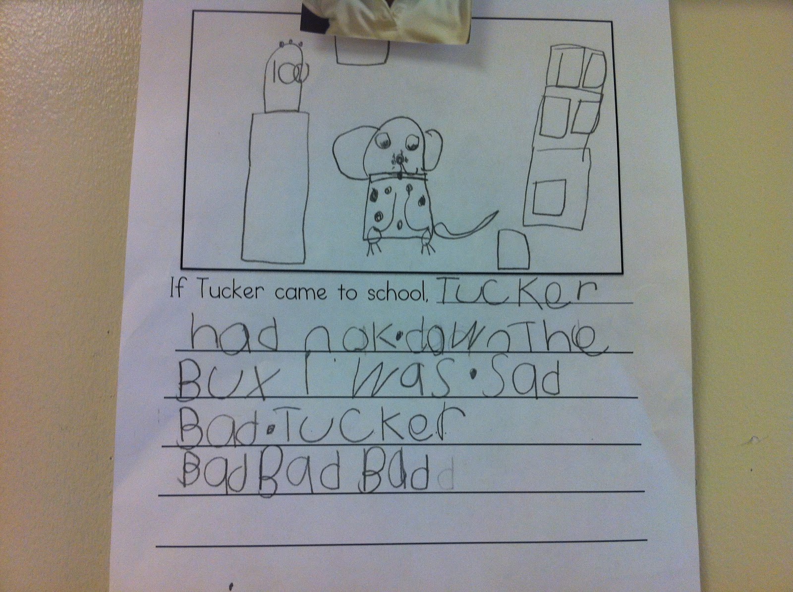 where the dog, Tucker, runs all over the house and makes a big mess. We then talked about what would happen if Tucker came to our school. (My kiddos love to talk about dogs as I am somehow always working my two pups, Jackson and Duncan into our lessons!) I created a story starter template and the kiddos let their imaginations run wild.