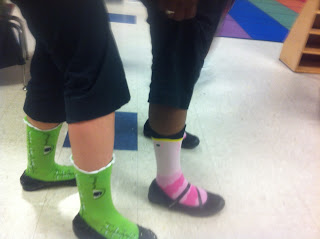 Our high-stakes test for 3rd-6th graders is next week so we've had a Spirit Week to get everyone pumped! Tuesday was Crazy Sock Day and I bought these gems for my assistant and I.
