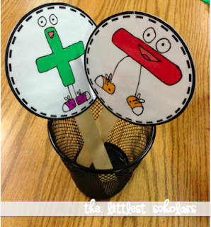 This past week we have been acting out addition and subtraction stories. I introduced them whole group during math meeting and then began working with our math story mats during small group. Some of my little scholars were still getting confused between add/plus/put together and subtract/minus/take-away. I wanted a quick way to check for understanding so I came up with these little goodies...