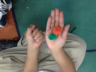 The students took turns "hiding" some of the pom poms while their partner had to figure out how many were missing. I loved observing my students during this activity as I was able to notice the strategies they used for figuring out how many were missing. Some students used their fingers, some tapped the rug, and others were definitely imagining a 5 frame in their heads.