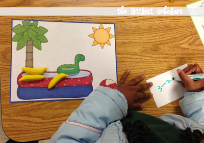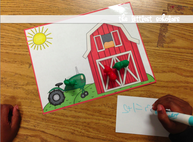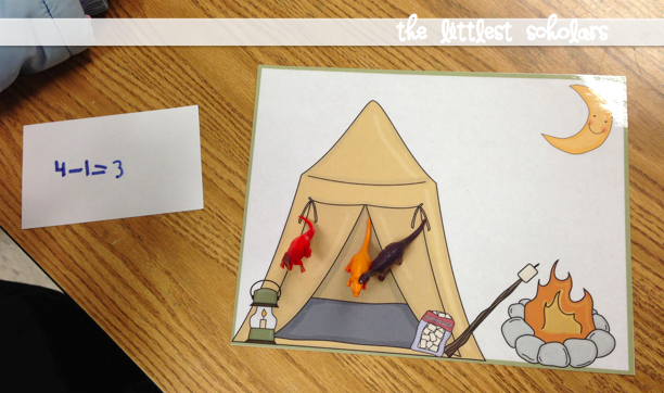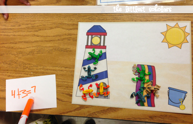 We've been working on addition and subtraction for quite a while...you can read about it [HERE] and [HERE]. I wanted my little scholars to synthesize their learning so I asked them to make up their own addition and subtraction stories AND write equations to match. They did such a fabulous job and had so much fun! We used these story mats that I made and whatever manipulatives they chose to act out their addition and subtraction stories. We had bananas in a pool, dinosaurs camping, sheep on a farm, and frogs at the beach. Having the opportunity to be creative and silly made this such a fun activity for them!
