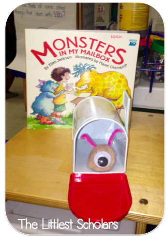 This week we read the story Monsters in my Mailbox and my little scholars LOVED it! The monsters have names that rhyme (Winky, Finky, Stinky) and there is lots of use of the Letter Mm (they made mudpies, ate marshallows, etc). We had a special delivery in our classroom mailbox....a monster of our own! Tomorrow they will get to make little monsters to take home! :)