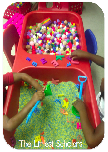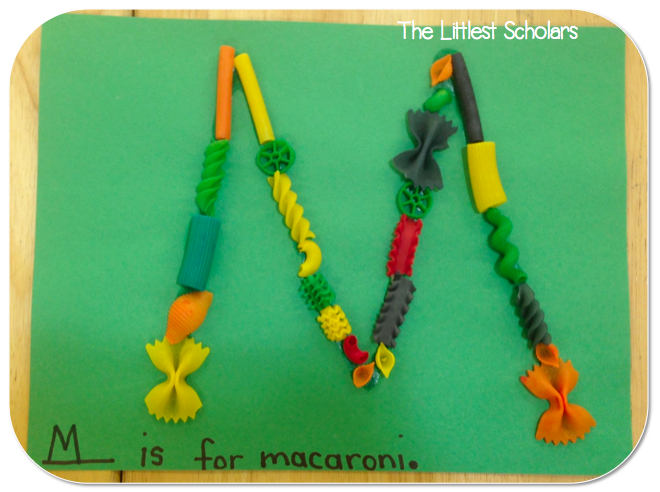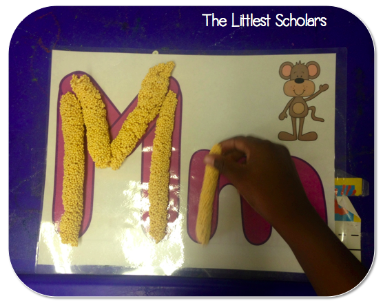During centers my little scholars made the Letter Mm out of play foam--a totally fabulous alternative to playdough since it doesn't dry out, made macaroni Ms, made Letter Mm ABC necklaces, and searched for letters at the sensory table.