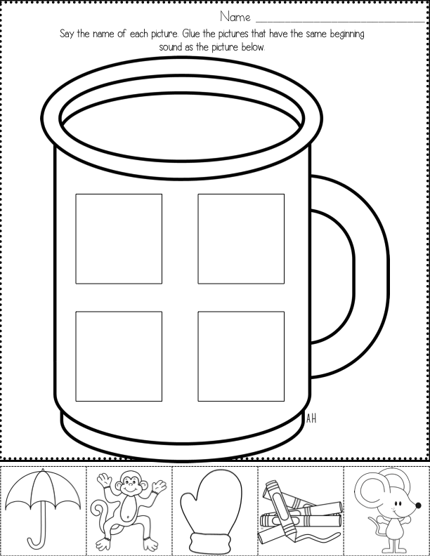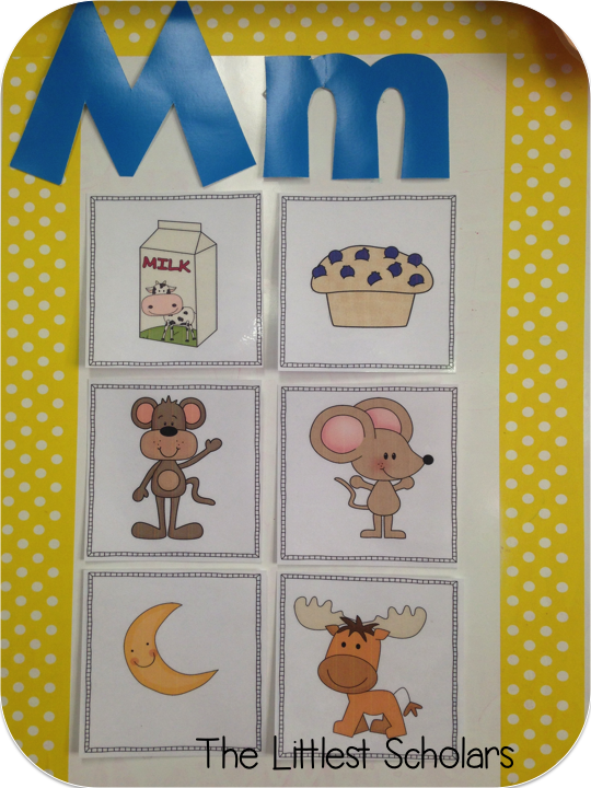 I introduce each letter with a "mystery bag." Inside said "mystery bag" are various objects that begin with the focus letter sound. I make a huge theatrical production of taking each item out and emphasizing the beginning sound "Mmmmmmmmmmonkey!" and "Mmmmmmmmose!" We then add our beginning sound pictures to our beginning sound picture wall that will eventually turn into our word wall when my little scholars are ready.