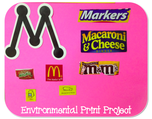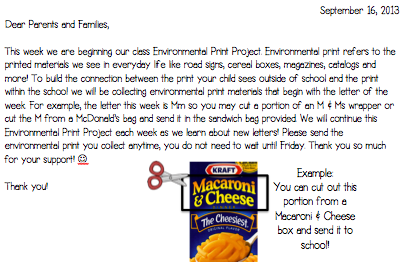 We follow a Letter of the Week curriculum so each week students will collect print that begins with the Letter of the Week. When my first kiddo brought some in on Tuesday I made a very big deal out of it..."Wow! Look at all the letters you found in your house!" Pretty soon we had more environmental print that begins with Mm than we knew what to do with. We added the environmental print to our environmental print wall door and my students are beginning to notice that letters aren't just in Pre-K-- they are all around us!