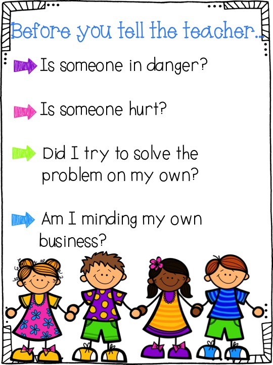 There are lots of great ideas to curb the tattling in classrooms. Some teachers have a stuffed animal that students can talk to, students can "tell the shell" and whisper into a conch shell, or create a tattle pledge that all students sign to remind them of their responsibility in contributing to the caring classroom.
