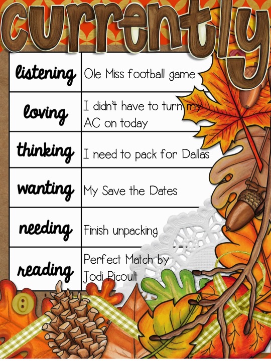 Listening: The game is long over now but it was good until the end when Ole Miss lost. My fiance used to tease that my family is un-American because we didn't watch football growing up. Like ever. Okay, maybe the Super Bowl but that's it. Perhaps having a nationally ranked football team nearby helped turn me into a fan!